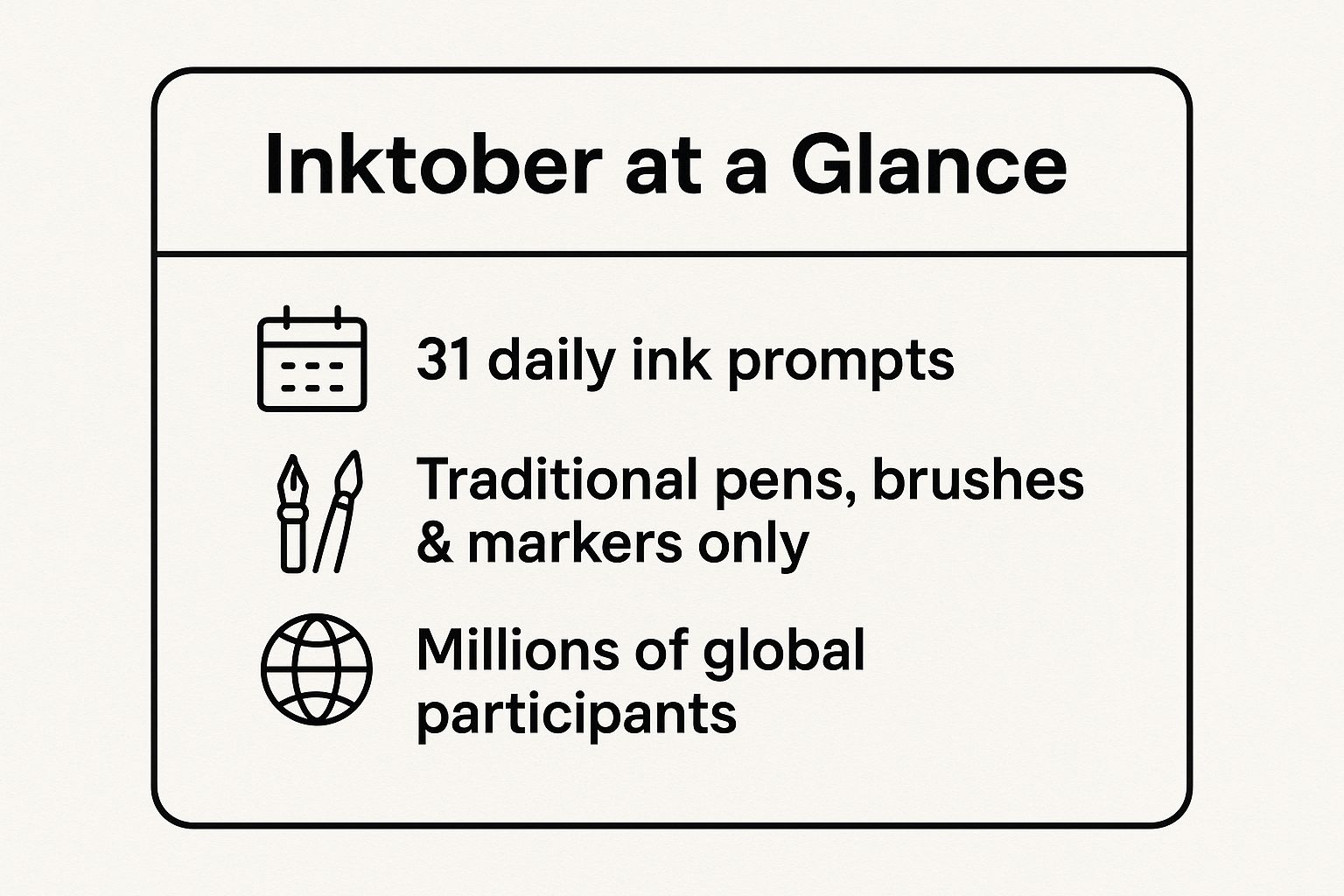 The infographic highlights that Inktober is defined by its 31 daily prompts, its focus on traditional ink media, and its massive global scale. This structure makes it an ideal challenge for artists seeking to build discipline and connect with a wider creative community. You can find the official prompts and guidelines on the Inktober website.