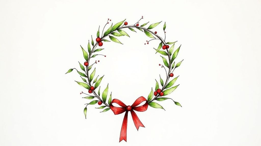 The beauty of drawing a wreath lies in its versatility. You can capture the rustic charm of a simple evergreen circle, the sacred look of an Advent wreath with glowing candles, or the opulent detail of a Victorian-era design dripping with bows and baubles. This subject is perfect for creating a focal point in a larger scene or a standalone piece that beautifully embodies the holiday spirit, much like the designs found in classic Christmas card drawing ideas.